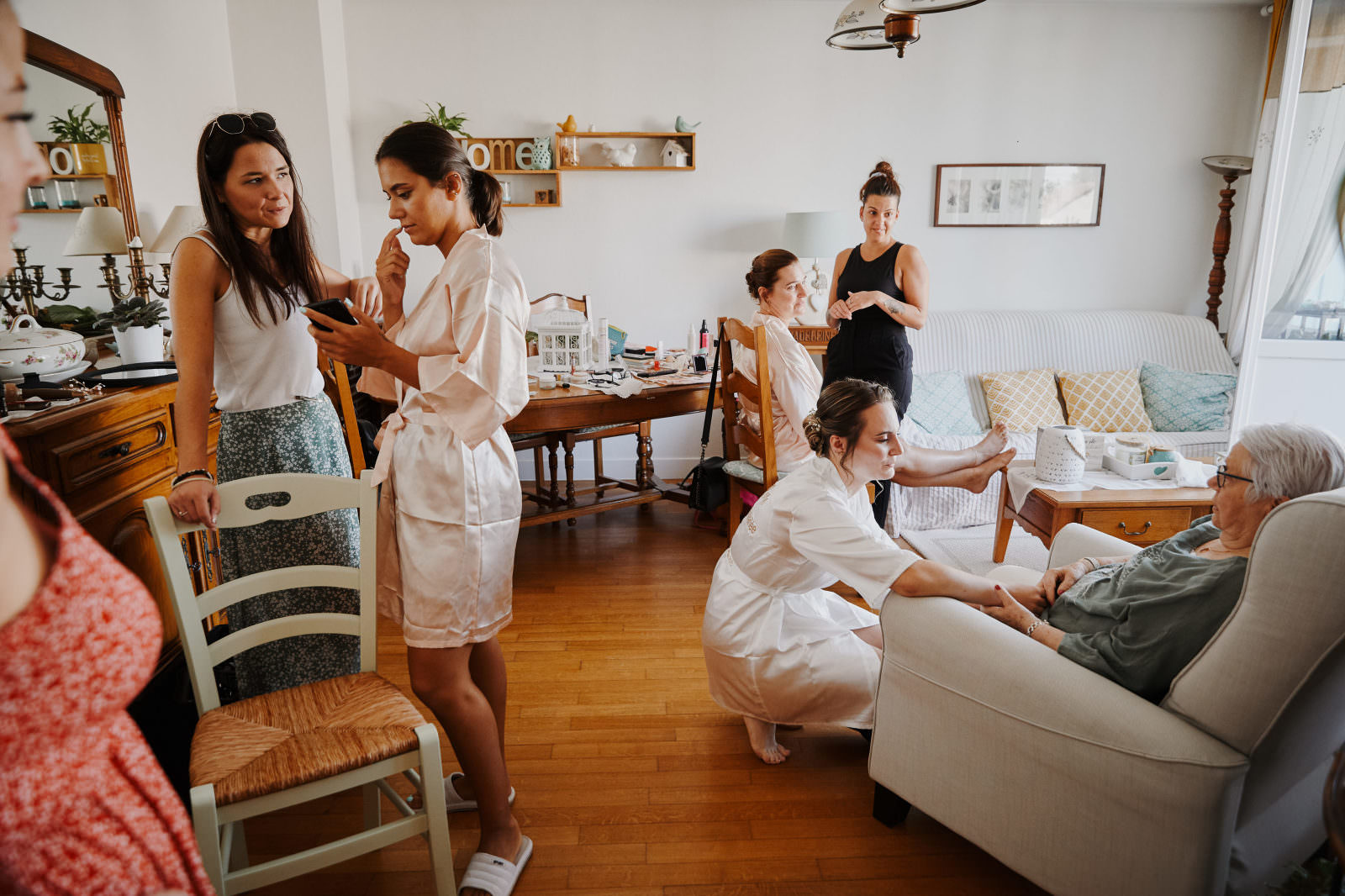 Tout, enfin l’essentiel. Vous et votre robe de mariée, vos chaussures, vos bijoux, la pièce dans laquelle vous vous préparez, le/la prestataire qui vous maquille, coiffe, votre famille, maman qui pleure et les amis présents. Le moment où vous enfilez votre robe, votre veste de costume, les petits détails, les enfants qui jouent en pyjama et la dernière relecture de vos vœux...