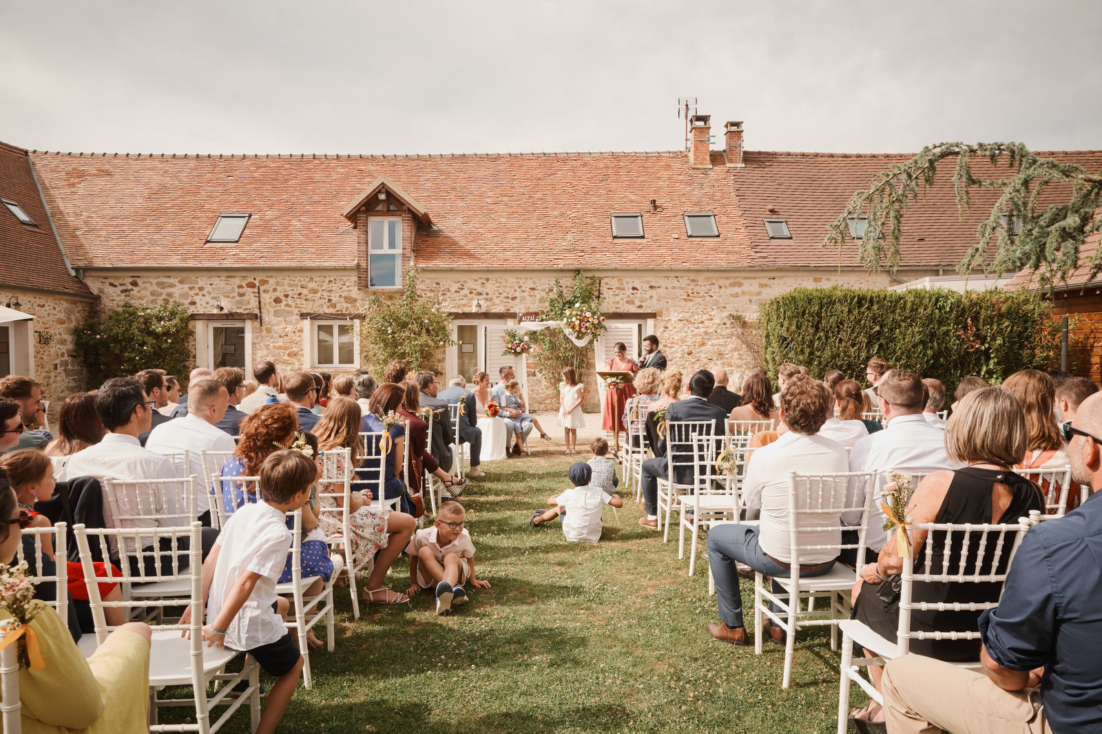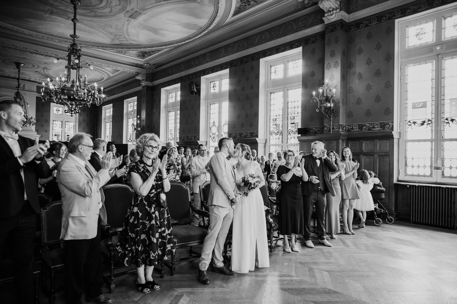 C'est la cérémonie officielle, celle qui a lieu la mairie donc. C’est un passage plutôt « formel » qui dure environ 30 minutes, avec lecture des actes par un élu, signatures des registres et applaudissements. Un passage non sans émotion tout de même, vous vous dîtes oui et vous êtes désormais mariés aux yeux de la loi.